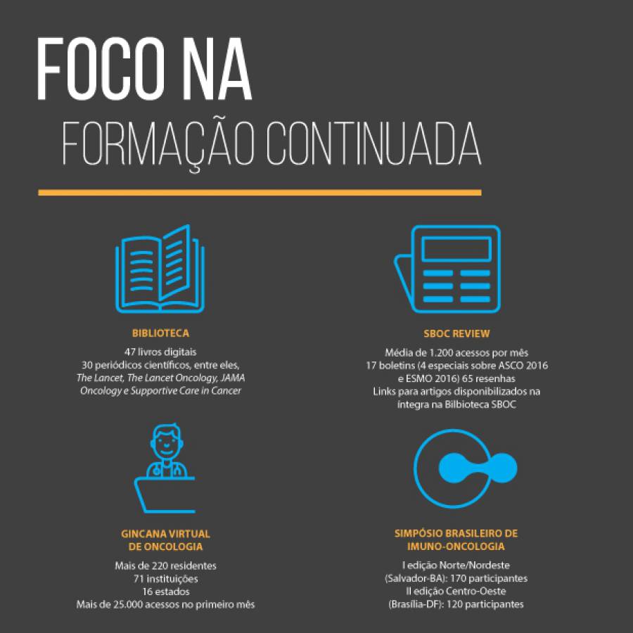 Também com foco na formação, a SBOC lançou em julho a Gincana Virtual de Oncologia para residentes da área. Com o objetivo de disseminar conhecimento médico em oncologia, a disputa on-line recebeu a inscrição de mais de 220 residentes de 71 instituições em 16 estados. “A ideia foi muito bem recebida. Já estamos pensando em ajustes para conseguir atrair ainda mais participantes na próxima edição”, diz a Dra. Clarissa Mathias, secretária geral da SBOC.